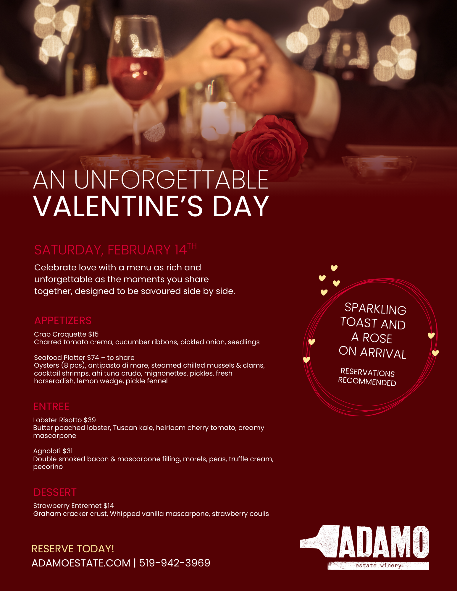 An unforgettable Valentine’s Day. Celebrate love with a menu as rich and unforgettable as the moments you share together, designed to be savoured side