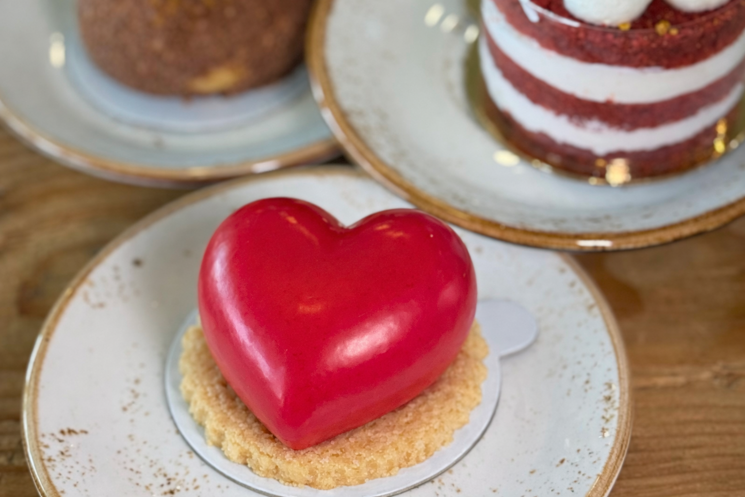 And for dinner, our featured heart dessert sets the tone: Passion fruit mousse layered with vibrant passion fruit compote, balanced by hazelnut milk chocolate ganache and finished in a delicate cocoa tart. Bright, silky, and indulgent, it pairs beautifully with a chilled glass of Frizzante.