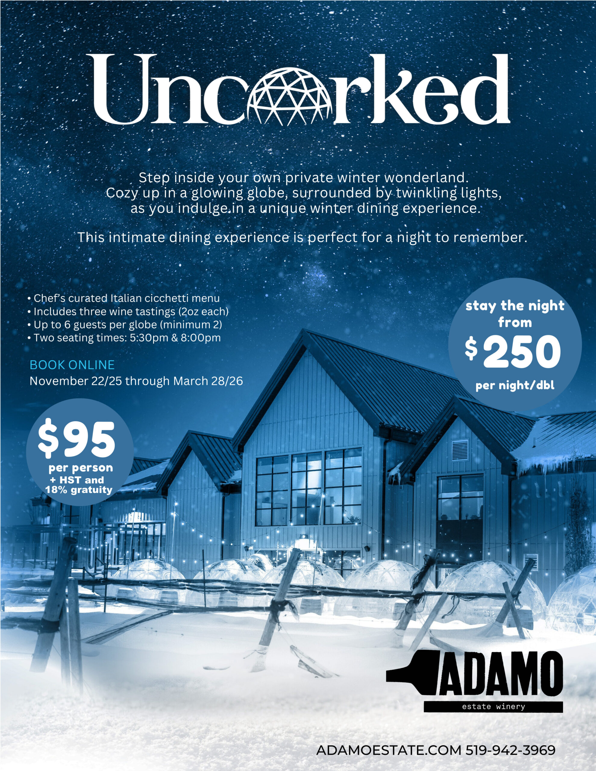 Enjoy complimentary shuttle service between Hockley Valley Resort and Adamo Estate Winery on Fridays and Saturdays every 30 minutes from 1:30pm-10:30pm.